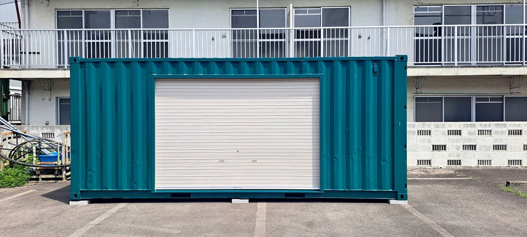 中古の20ft(20フィート)海上コンテナの側面に開口3mのシャッター取り付け加工を施した商品です。シャッター位置やサイズはお打ち合わせの上、変更可能です(施工箇所により追加料金が発生する場合もございます)。